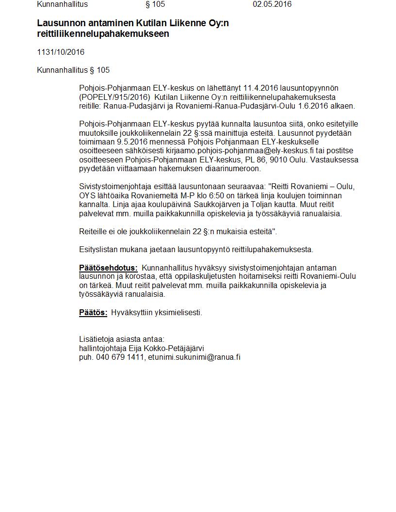 Pöytäkirja 02.05.2016 Pykälä 105