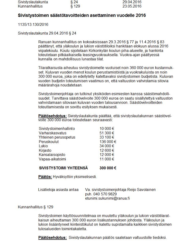 Pöytäkirja 23.05.2016 Pykälä 129