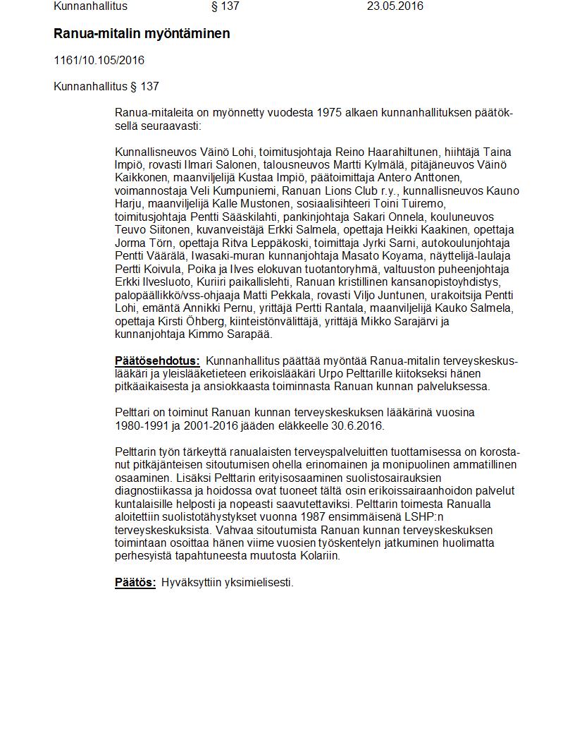 Pöytäkirja 23.05.2016 Pykälä 137