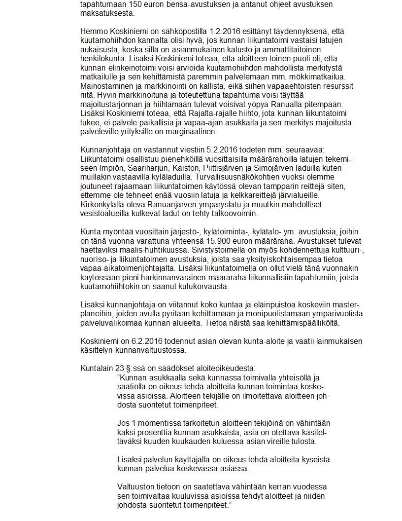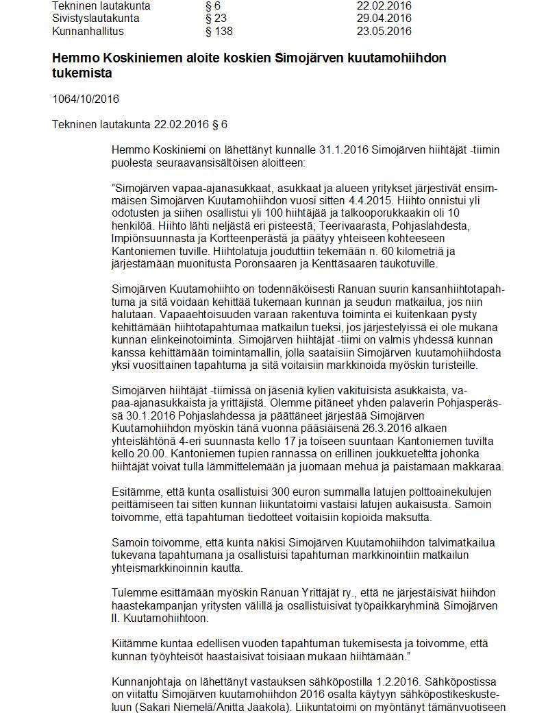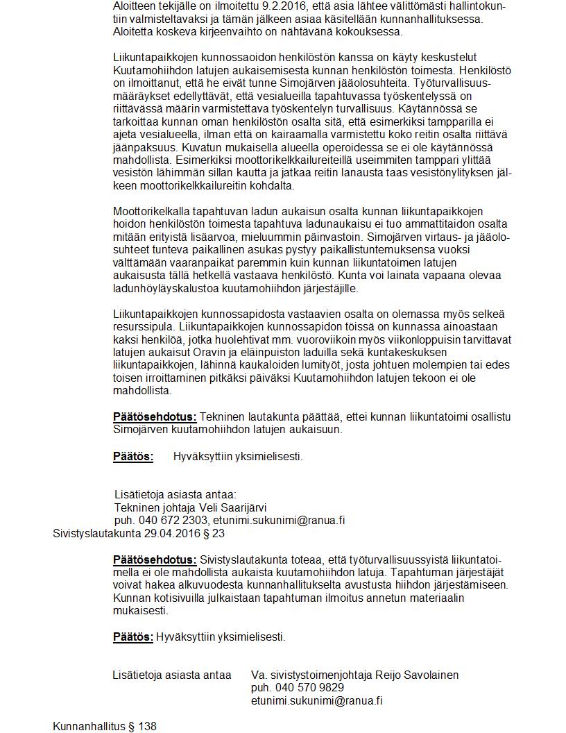 Pöytäkirja 23.05.2016 Pykälä 138