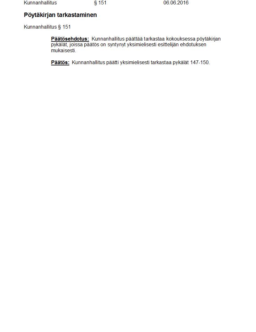 Pöytäkirja 06.06.2016 Pykälä 151