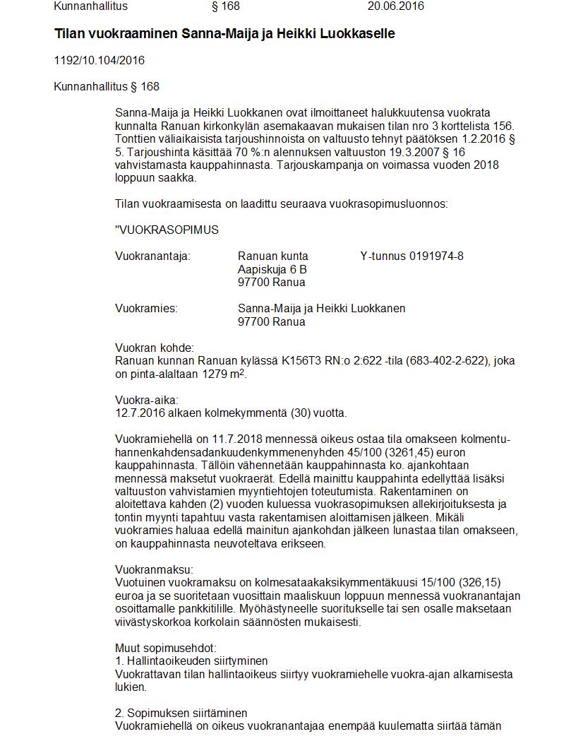 Pöytäkirja 20.06.2016 Pykälä 168