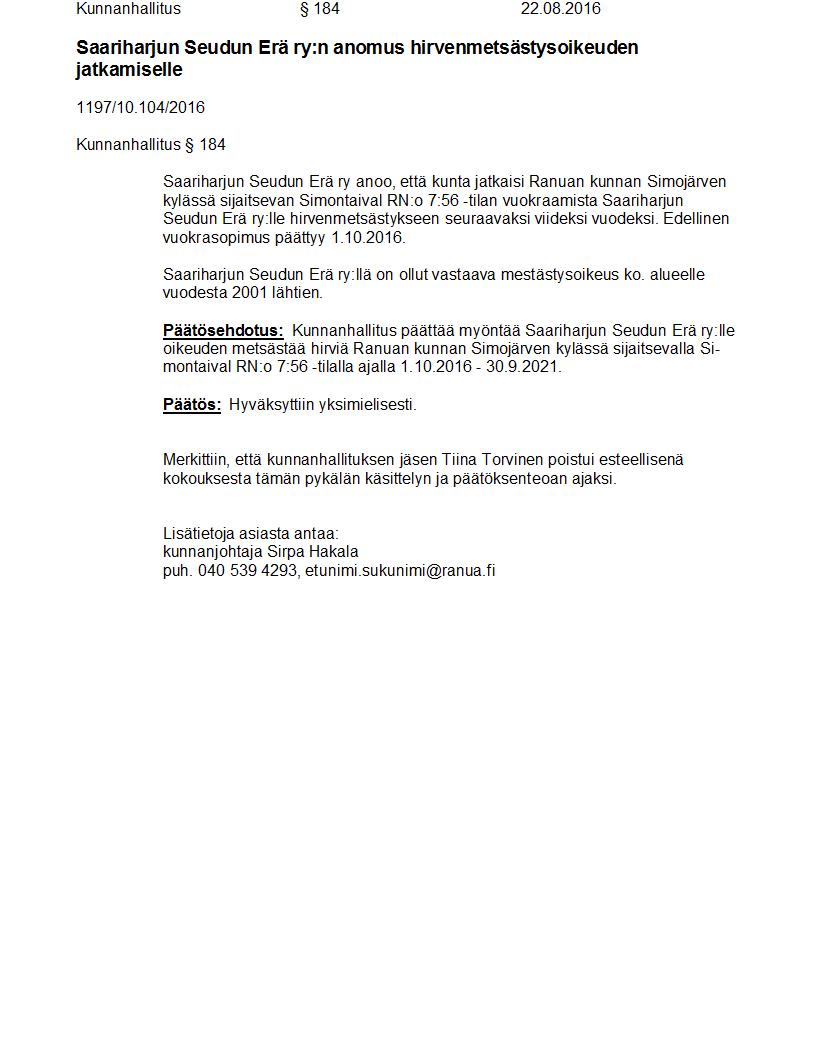 Pöytäkirja 22.08.2016 Pykälä 184