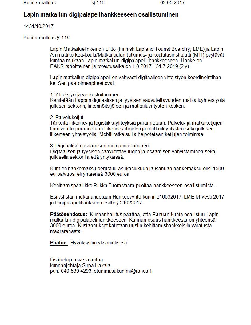 Pöytäkirja 02.05.2017 Pykälä 116
