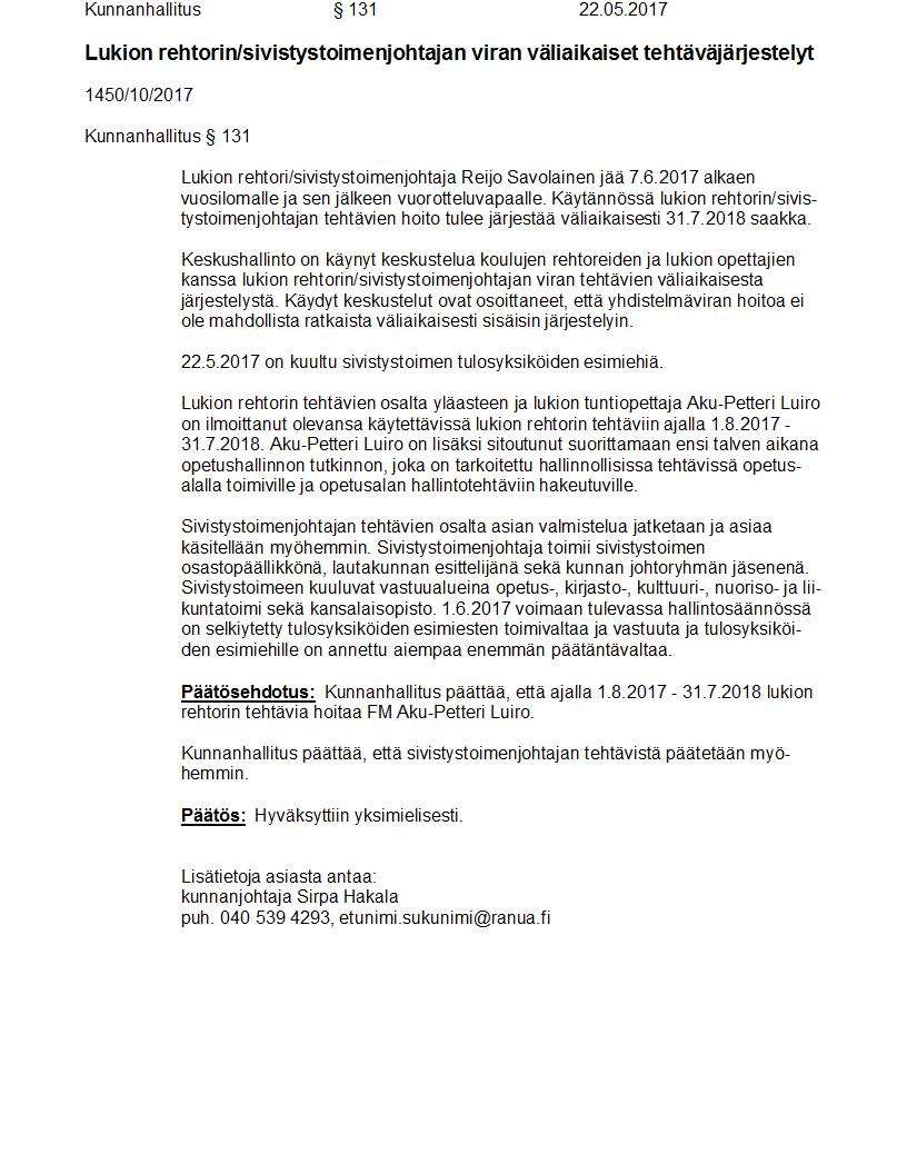 Pöytäkirja 22.05.2017 Pykälä 131