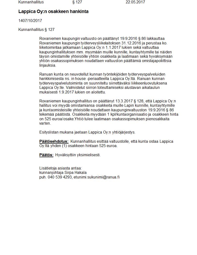 Pöytäkirja 22.05.2017 Pykälä 127