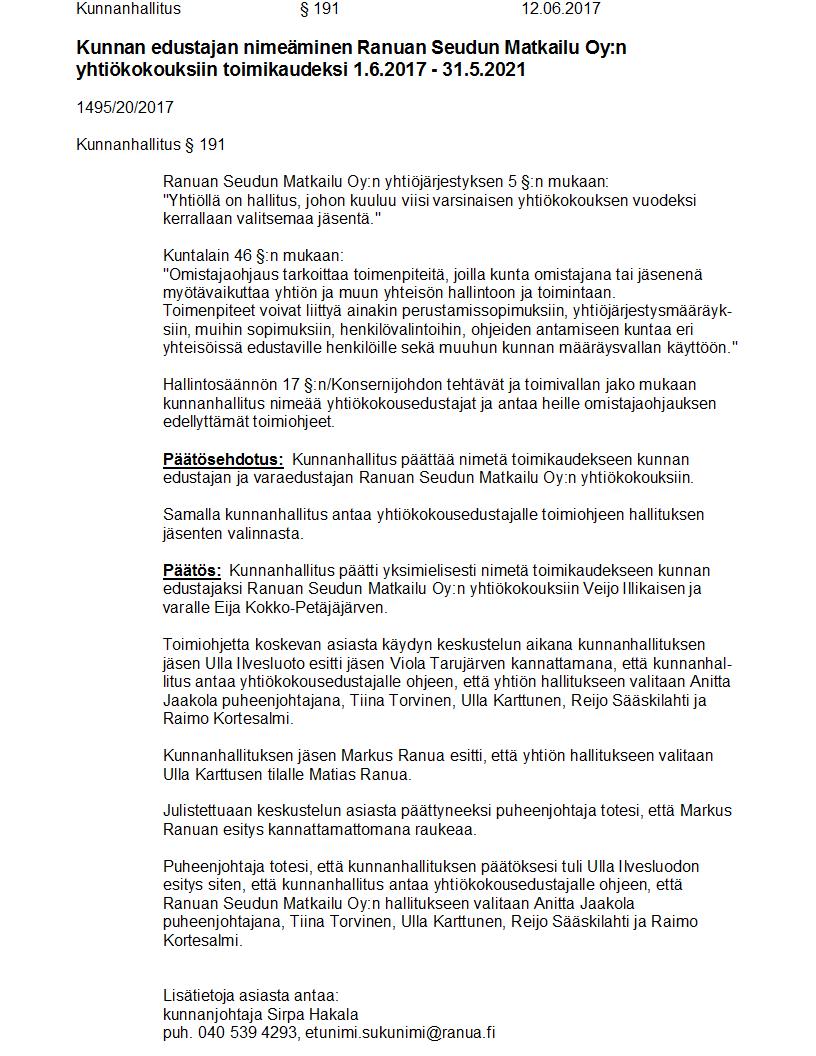 Pöytäkirja 12.06.2017 Pykälä 191