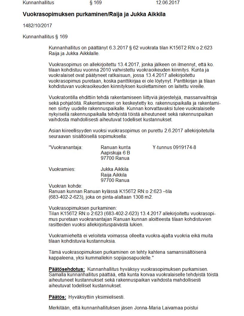 Pöytäkirja 12.06.2017 Pykälä 169