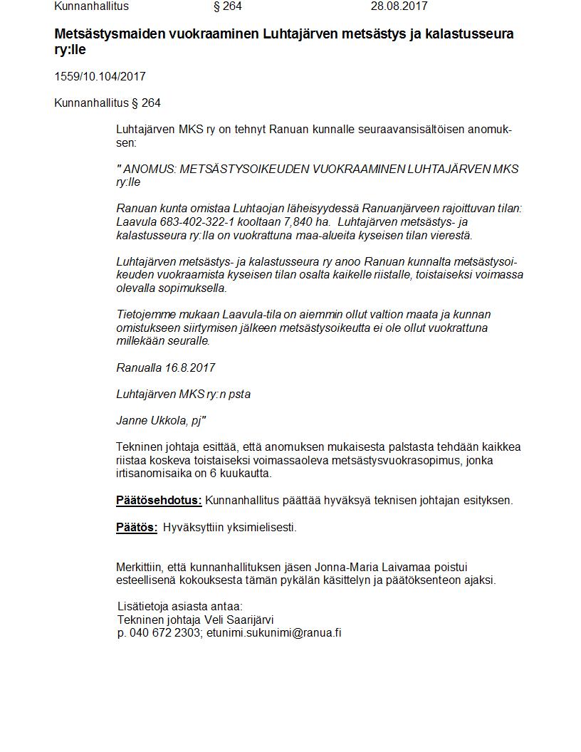 Pöytäkirja 28.08.2017 Pykälä 264