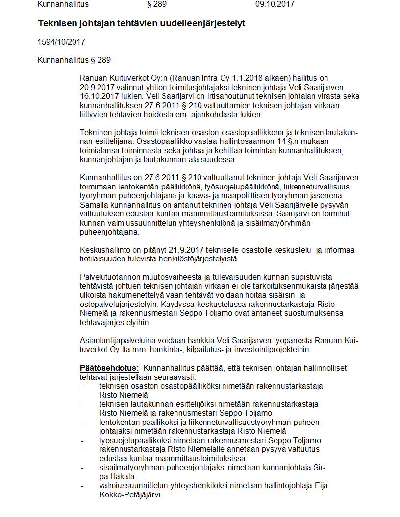 Pöytäkirja 09.10.2017 Pykälä 289