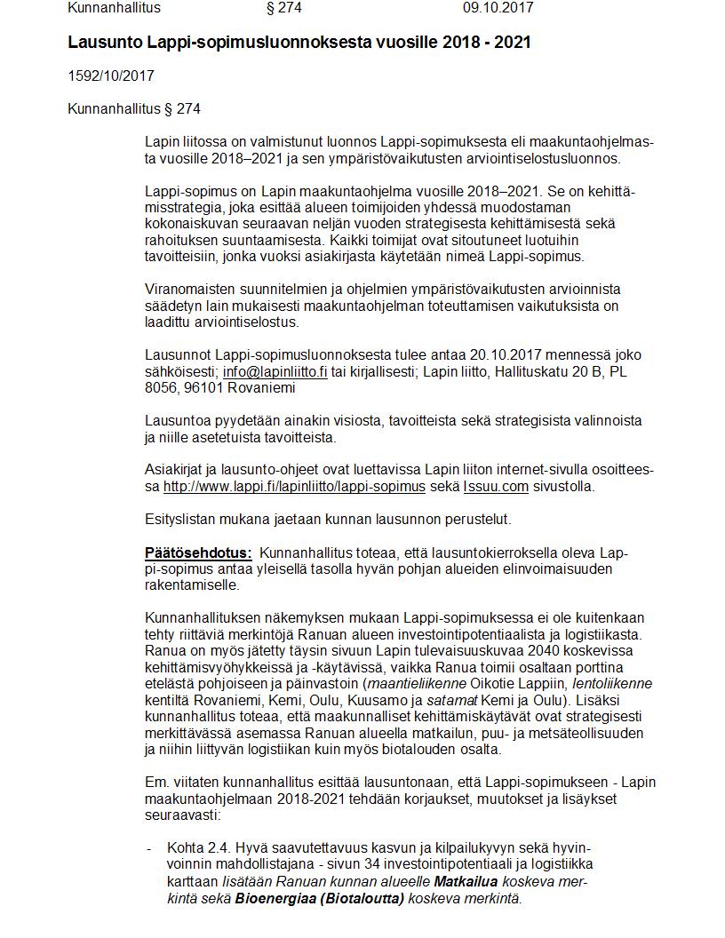 Pöytäkirja 09.10.2017 Pykälä 274