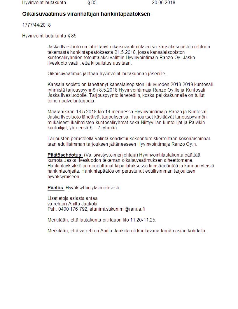 Pöytäkirja 20.06.2018 Pykälä 85
