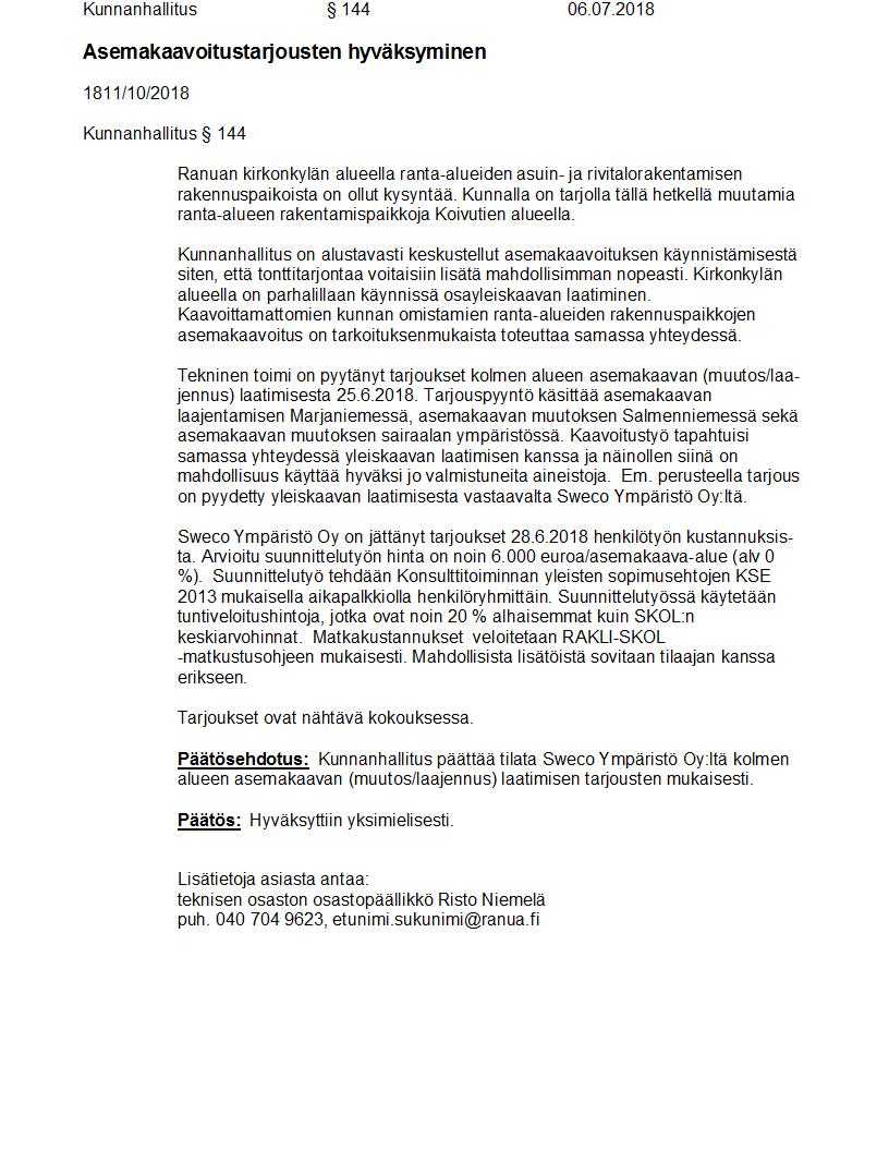 Pöytäkirja 06.07.2018 Pykälä 144