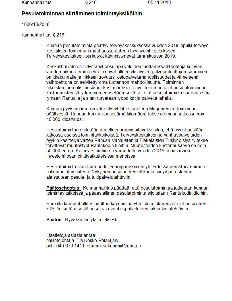Pöytäkirja 05.11.2018 Pykälä 216