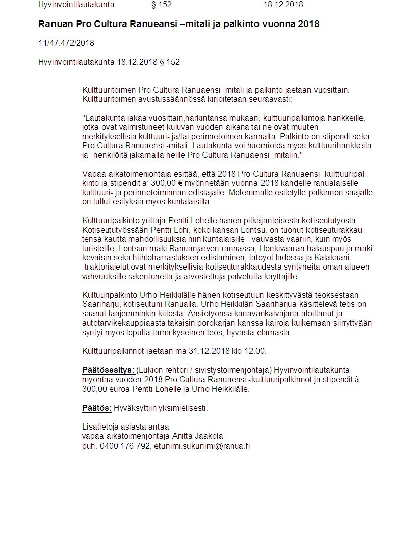 Pöytäkirja 18.12.2018/Pykälä 152