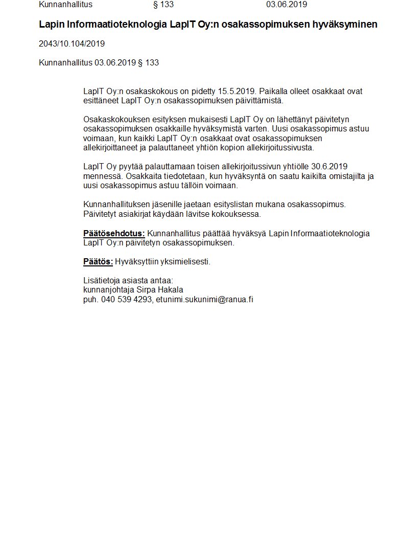 Pöytäkirja 03.06.2019/Pykälä 133