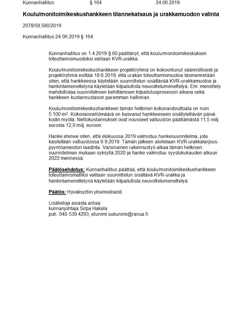 Pöytäkirja 24.06.2019/Pykälä 164