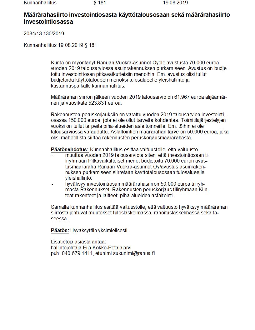 Pöytäkirja 19.08.2019/Pykälä 181