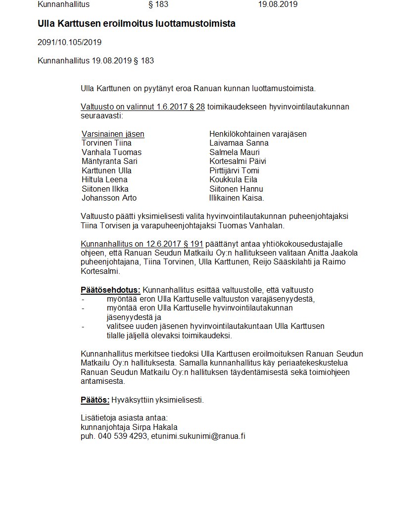 Pöytäkirja 19.08.2019/Pykälä 183