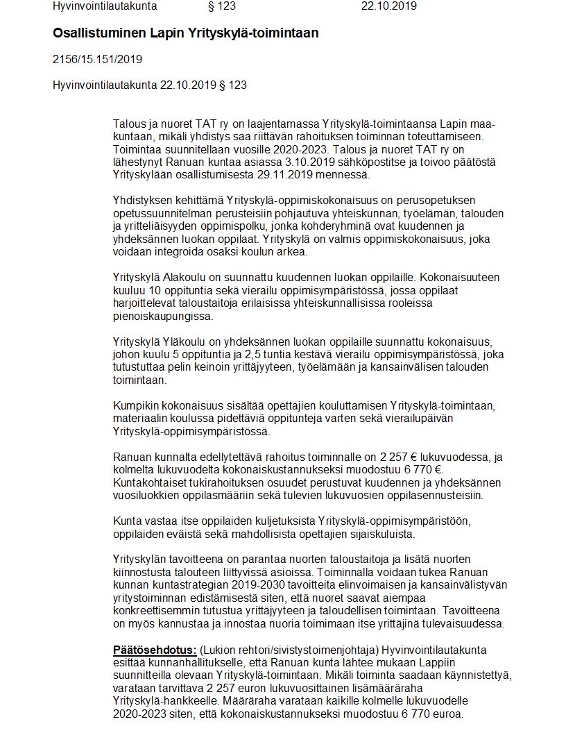 Pöytäkirja 22.10.2019/Pykälä 123