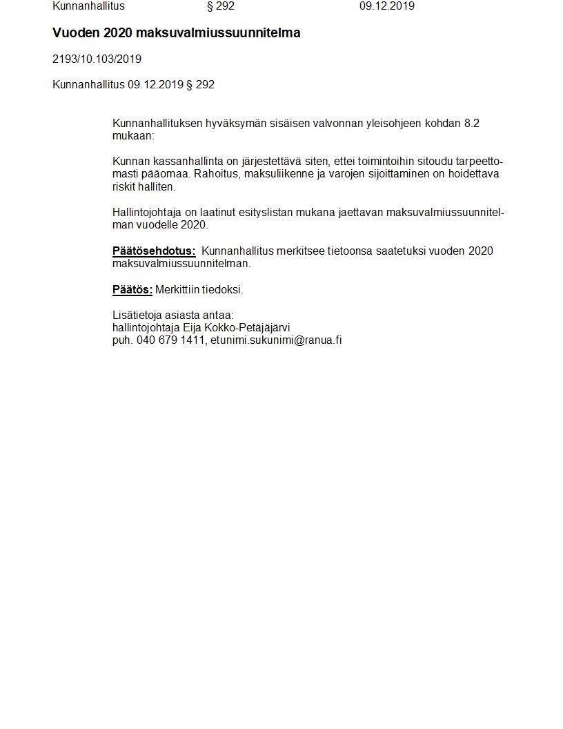 Pöytäkirja 09.12.2019/Pykälä 292