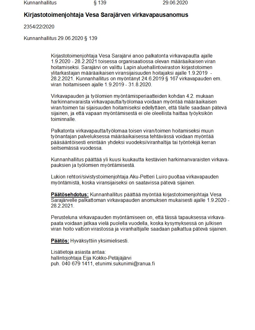 Pöytäkirja 29.06.2020/Pykälä 139