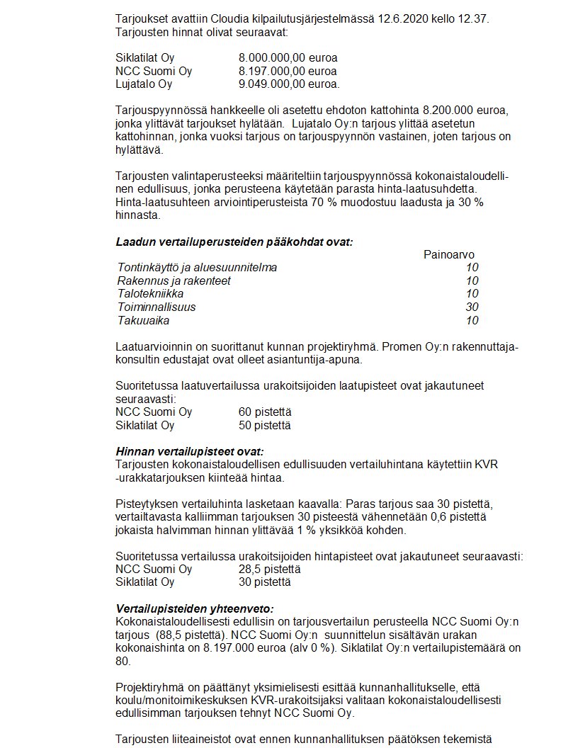 | Koulu/monitoimikeskusm Tarjousten laatu- ja hintapisteet ja pisteytyksen perustelut |