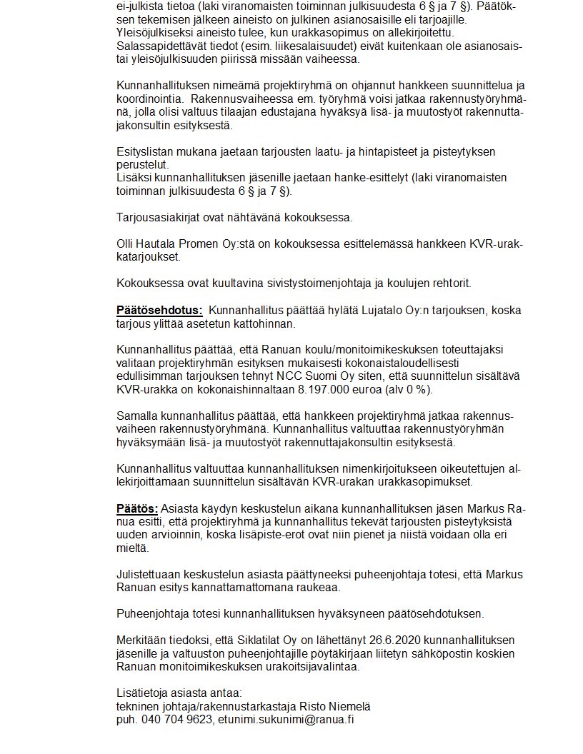 | Siklatilat Oy:n kunnanhallituksen jäsenille ja valtuuston puheenjohtajille 26.6.2020 lähettämä sähköposti |