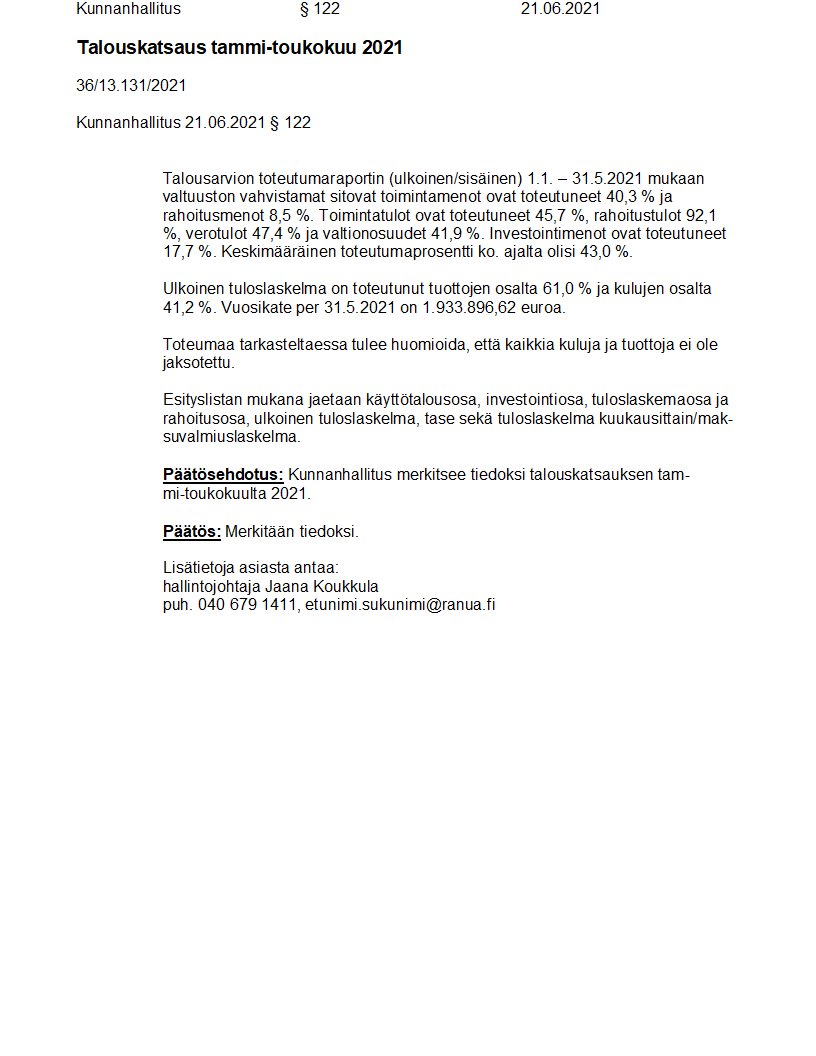Pöytäkirja 21.06.2021/Pykälä 122