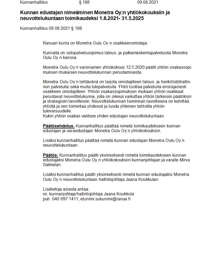 Pöytäkirja 09.08.2021/Pykälä 188