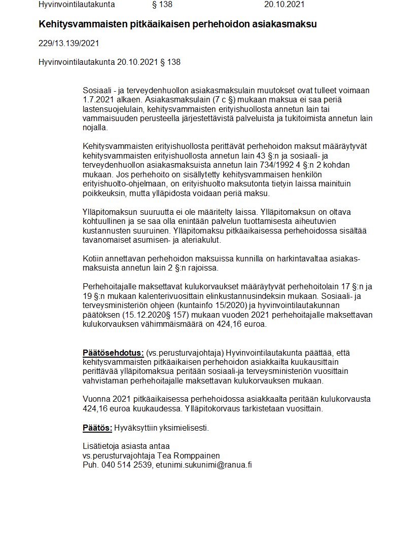 Pöytäkirja 20.10.2021/Pykälä 138