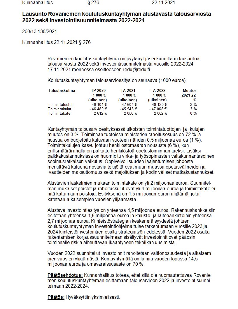 Pöytäkirja 22.11.2021/Pykälä 276